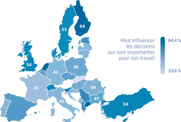 Dans le champ du management, l'enquête de la Fondation de Dublin (Fondation européenne pour l'amélioration des conditions de vie et de travail) sur la qualité de vie sur les conditions de travail (EWCS) de 2015 illustre concrètement la difficulté et les enjeux auxquels les entreprises sont aujourd'hui confrontées si elles souhaitent répondre aux aspirations sociétales de leurs clients et de leurs salariés. Cette étude approche le niveau d'engagement des salariés à travers un indice qui combine les réponses à différentes questions et affirmations (« au travail, je me sens plein d'énergie », « je suis enthousiaste au sujet de mon travail », « le temps passe vite quand je travaille », « je me sens épuisé à la fin de la journée », « je doute de l'importance de mon travail »). L'indice moyen de l'engagement des salariés français se situe en dix-huitième position parmi les 35 pays étudiés. De nombreuses dimensions peuvent évidemment expliquer cette situation. L'une d'entre elles a retenu notre attention. La France figure parmi les trois derniers pays dans lesquels les travailleurs ont le sentiment qu'ils peuvent influencer les décisions qui sont importantes pour leur travail : seuls 41 % pensent qu'ils peuvent peser, quand la proportion atteint 64 % dans les entreprises finlandaises, en tête du classement.